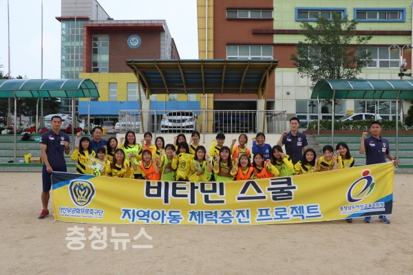 충남 아산무궁화는 지난 28일, 아산 신창면에 위치한 남성초등학교를 방문해 방과 후 축구 동아리 활동에 참여하고 있는 여자 어린이들을 대상으로 일일 축구 교실 프로그램인 ‘비타민 스쿨’을 진행 했다.