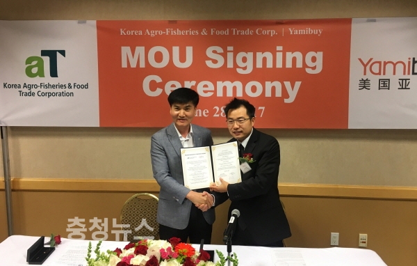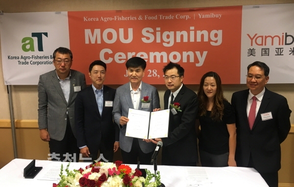 한국농수산식품유통공사(aT, 사장 여인홍)는 지난 28일 미국 로스앤젤레스에서 미국 내 중국계 온라인 쇼핑몰 Yamibuy사(대표 Alex Zhou)와 한국 농식품 입점 확대 및 마케팅 지원에 관한 업무협력약정(MOU)을 체결하였다.