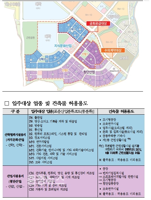 금번 분양되는 산학협력시설용지는 지식문화산업 업종을 중심으로 분양되며 출판, 영상, 통신, 정보․교육․사업지원 서비스업 등의 관련 업종을 대상으로 입주가 허용된다(입주대상 업종 참조).