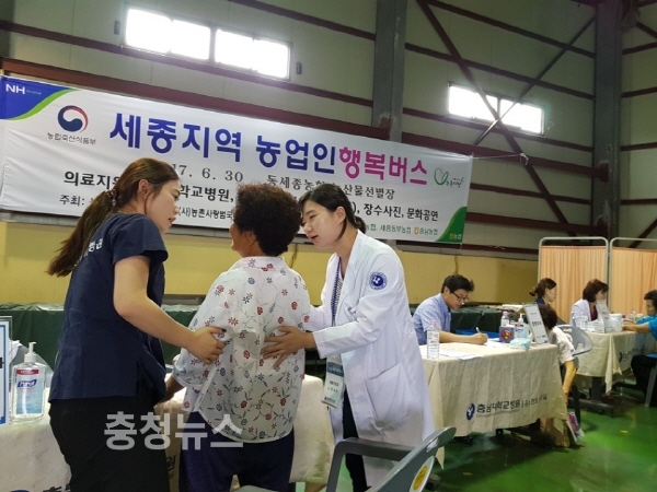이날 충남대학교 병원 의료봉사는 세종지역(동세종, 조치원, 세종동부) 고령농업인 300여명을 대상으로 무료진료를 실시했다. 내과, 정형외과, 마취통증과, 재활의학과 등 주로 농업인의 고질적인 질환을 진료하였으며