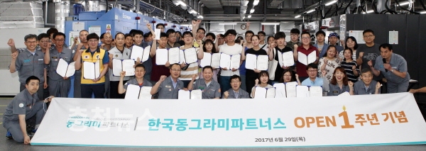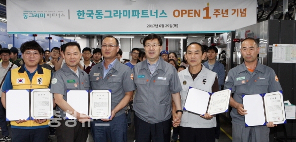 한국타이어(대표이사 서승화)가 지난 29일 한국타이어 대전공장에 위치한 자회사형 장애인 표준사업장인 ‘한국동그라미파트너스’의 오픈 1주년 기념 행사를 개최했다.