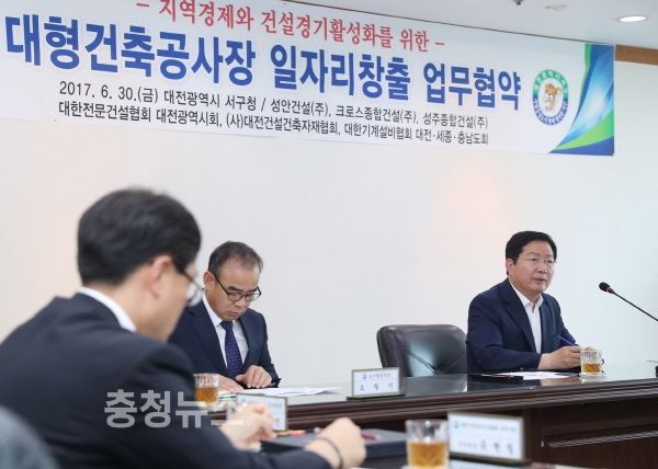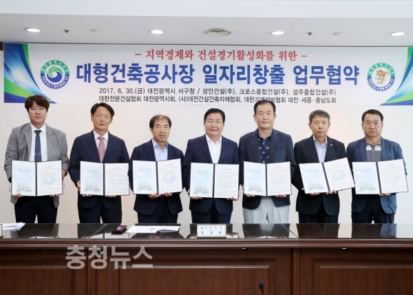 대전 서구(구청장 장종태)는 지난 30일 구청 다목적실에서 성안건설(주), 크로스종합건설(주), 성주종합건설(주), 대한전문건설협회 대전시지회, 사단법인 대전건설 건축자재협회, 대한기계설비건설협회 대전·세종·충남도회와 ‘대형건축공사장 일자리 창출’ 업무협약(MOU)을 체결했다고 밝혔다.