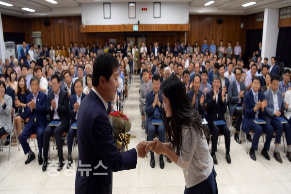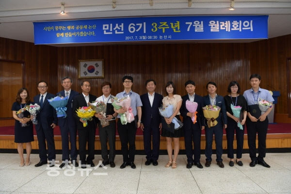 황명선 논산시장이 7월 월례회의에서 “민선6기 3년동안 거둔 많은 성과들은 시민사회의 격려와 성원을 기반으로 열정을 갖고 노력해온 공직자들의 노력 덕분”이라며 그간 모든 공로를 치하하고 축하를 나눴다.