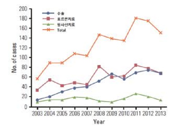 즉 2003년에 22.4%에 그쳤던 수술은 2013년 45.4%로 크게 증가했다. 반대로 60.3%에 달했던 호르몬 치료는 10년 새 45.4%로 감소했고 방사선 치료도 지난 10년간 일정하지는 않았지만 대체로 감소세(2003 17.2%, 2006 18.4%, 2009 7.2%, 2013 9.2%)를 보였다.