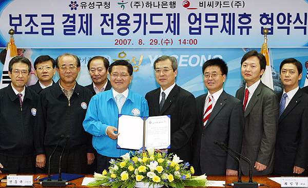유성구(구청장 진동규)는 29일 오후 2시 중회의실에서 (주)하나은행과 이같은 내용의 보조금 전용 결제카드 시행을 위한 업무제휴 협약을 체결했다.