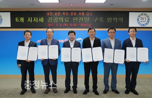 대전시는 6일 시청 중회의실에서 대전을 의료 생활권으로 하고 있는 충북 보은군, 옥천군, 영동군, 충남 계룡시, 금산군과 ‘공공의료안전망 구축 및 재난 공동대응 협약’을 체결했다.