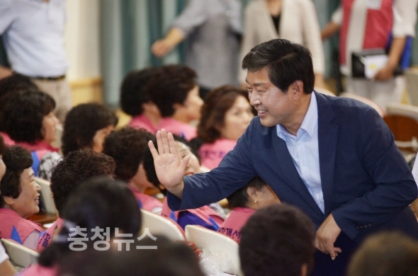 생활개선논산연합회 수련대회에 회원들과 인사하는 황명선 시장