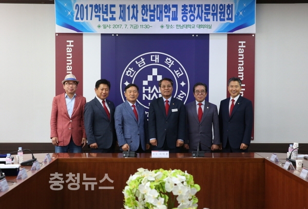한남대 총장자문위원회에 참석한 각계 인사들. 사진 왼쪽부터 조웅래 (주)맥키스컴퍼니 회장, 김동원 국제라이온스 356-B지구 총재, 김원식 중도일보 회장, 이덕훈 한남대 총장, 성하준 남대문시장상인회 회장, 김병순 (주)나노하이테크 대표.