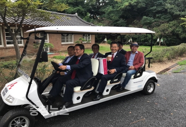 이덕훈 한남대 총장이 직접 전동카트를 운전하면서 총장자문위원들의 캠퍼스 투어를 진행하고 있다.