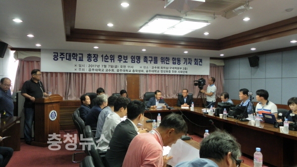 국립 공주대학교의 총장공백장기화 사태가 40개월째 지속중인 가운데 지난 7일 오전, 공주대 교수회, 총학생회, 경영행정대학원 원우회와 시민사회단체 등은 공주대 교수회 회의실에서 합동 기자회견을 열고, 1순위 후보의 총장 임용을 강하게 촉구했다.