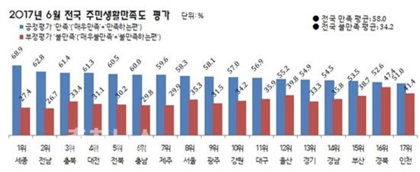 세종시는 전국 광역 시·도의 주민생활만족도를 묻는 질문에서도 68.9%를 기록하며 전국에서 가장 높은 만족도를 나타냈다.