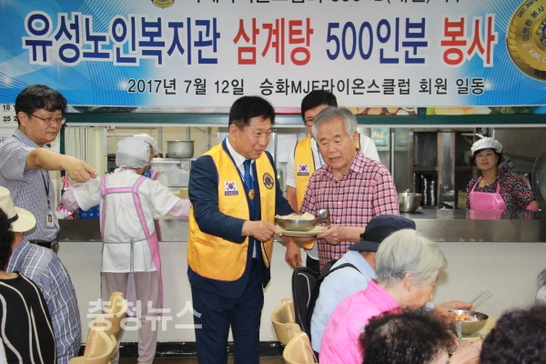 국제라이온스협회 356-B지구 김동원 총재는 지난 11일 유성구 노인복지관에서 대전승화라이온스클럽(회장 김영직)에서 초복을 맞이하여 전개한 지역어르신 초청 500명 삼계탕 대접봉사에 참석하여 효봉사를 펼쳤다.