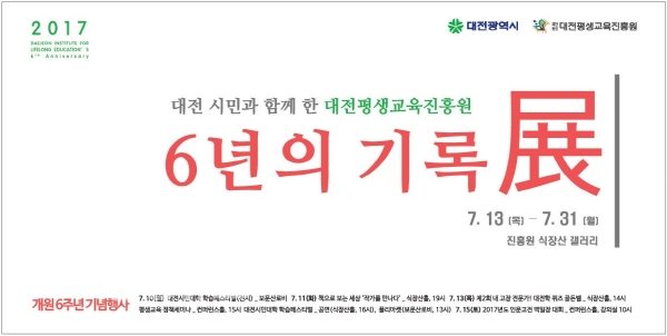 대전평생교육진흥원(원장 송용길)은 ‘개원 6주년 기념 기록전’을 오는 13부터 31일까지 진흥원 내 식장산 갤러리에서 개최한다고 밝혔다.