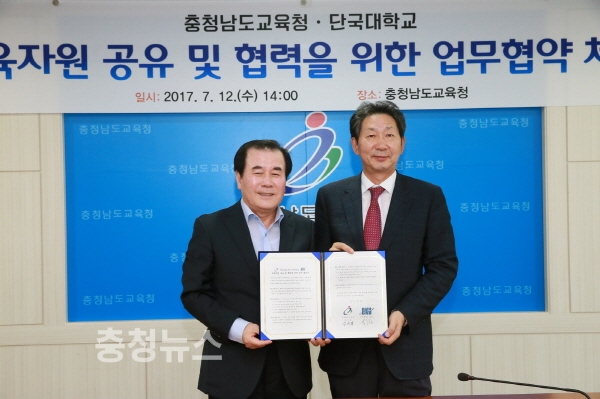 충남도교육청(교육감 김지철)은 12일 도교육청 제1회의실에서 단국대학교(총장 장호성)와 업무 협약을 체결하고 협약서를 교환했다.