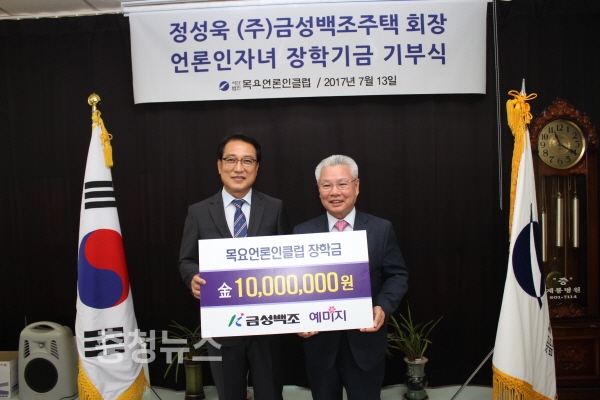 금성백조주택(회장 정성욱)이 목요언론인클럽(회장 곽영지)에 언론인 자녀 장학금으로 써달라며 1천만 원을 기탁하였다.