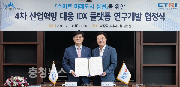 종특별자치시(시장 이춘희)와 ETRI(한국전자통신연구원·원장 이상훈)는 13일, 세종시에서 ‘스마트 미래도시 실현’을 위한 MOU를 체결했다.