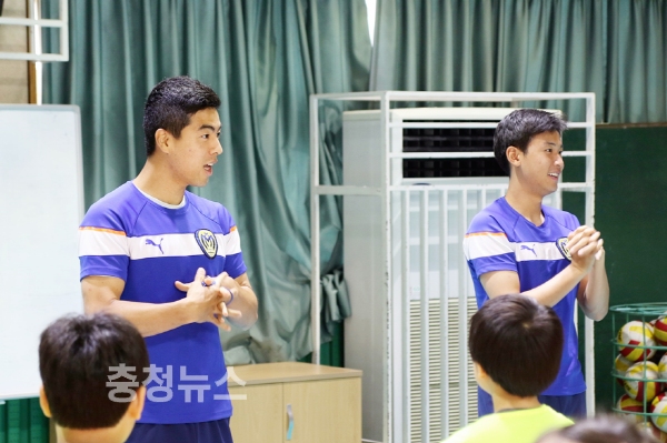 충남 아산무궁화프로축구단 선수들이 아산 둔포초등학교 어린이들의 일일교사로 나서 재밌는 추억을 선사했다.