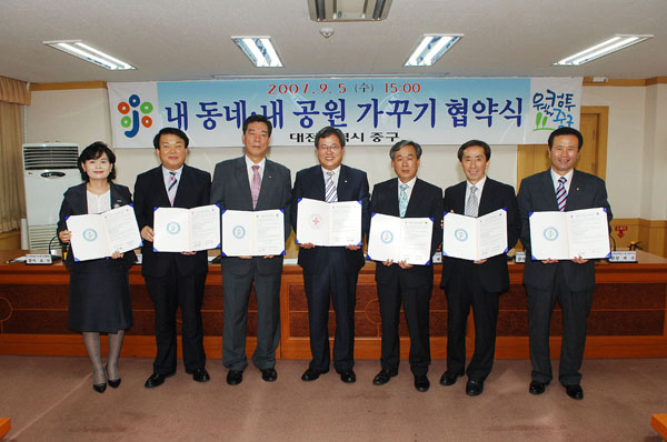 대전광역시 중구(구청장 이은권)는 시민들에게 깨끗하고 쾌적한 도시환경과 휴식공간을 제공할 목적으로 조성된 도심 공원을 효율적인 관리 체계를 구축하기 위해 9월 5일 오후 3시 중회의실에서 중구청과 학교, 기관․단체 간 내동네․내공원 가꾸기 협약식을 가졌다.
