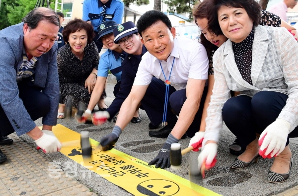 14일 산성초등학교 앞 횡단보도에서 실시된 노란발자국 설치행사에는 구청과 중부경찰서, 대전준법지원센터, 중부녹색어머니회, 산성초등학교가 함께했다.