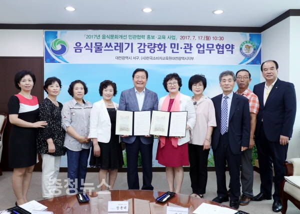 대전광역시 서구(구청장 장종태)는 17일 구청 다목적실에서 (사)한국소비자교육원 대전광역시지부와 음식물쓰레기 감량을 위한 업무협약을 체결했다고 밝혔다.