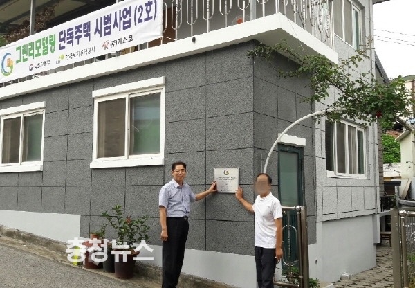 공주시 옥룡동에 위치한 그린리모델링 단독주택 시범사업 2호(사업자 (주)케스코)가 17일 준공과 함께 현판식을 개최했다.