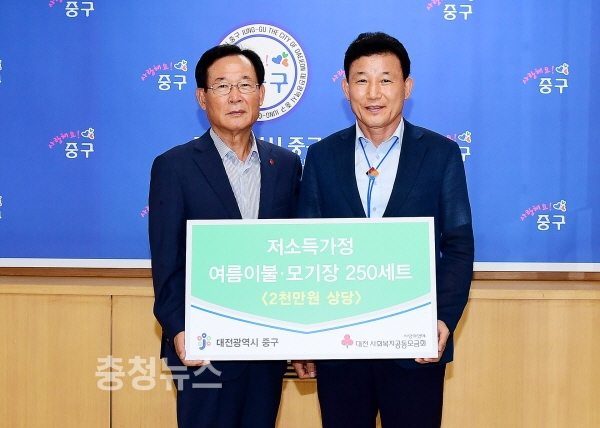 대전 중구(구청장 박용갑)는 지난 17일 대전사회복지공동모금회(회장 안기호)로부터 저소득가정의 시원한 여름나기를 위한 사업의 일환으로 2000만원 상당의 여름이불과 모기장 세트를 전달받았다고 밝혔다.