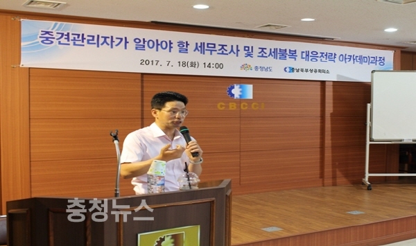 충남북부상공회의소(회장 한형기)는 18일 충남북부상의 중회의실(9층)에서 천안/아산/예산/홍성지역 기업체 중견관리자 100여명이 참석한 가운데 ‘세무조사 및 조세불복 대응전략 아카데미’를 개최했다.