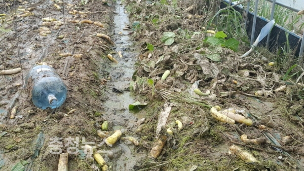 이곳에서는 복구작업이 시작된 지난 17일부터 비로 쓰러진 30여동의 비닐하우스 제거 작업과 함께 수십톤의 농작물 폐기처분 작업이 진행 중이다.