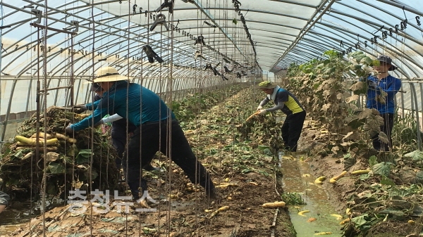 이날 최고 253㎜의 집중호우로 인근 병천천의 물이 비닐하우스를 덮쳐 물에 잠기며 수확을 코앞에 두고 오이를 모두 폐기처분해야 하기 때문이다.
