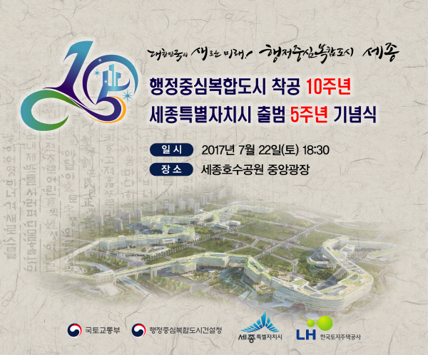 행정중심복합도시 착공 10주년과 세종특별자치시 출범 5주년을 기념하는 행사를 이달 22일 오후 6시 30분부터 세종호수공원에서 개최한다.