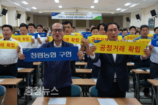농협중앙회 충남지역본부(본부장 유찬형)는 20일 지역본부 대회의실에서 충남농협 전 임직원이 참석한 가운데 최근 사회적 문제로 대두되고 있는 불공정 거래행위의 예방교육과 높은 수준의 공정거래문화 확립을 위한 결의대회를 개최했다.