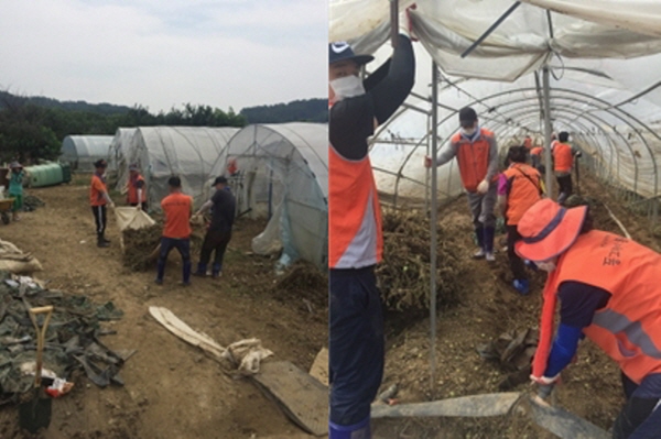 이날 동그라미봉사단은 기록적인 폭우로 피해를 입은 충북 청주지역 농가 등을 찾아 토사와 부유물제거, 비닐하우스 시설 복구 등을 진행하며 시름에 잠긴 청주지역 수재민들의 마음을 위로했다.
