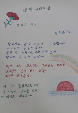 김삼순 어르신은 “글을 배우게 된 것도 고마운 일인데 출품한 작품이 전국대회에 진출하고 전시까지 하게 될 줄은 꿈에도 몰랐다”면서 “이러한 기회를 준 예산군과 문해교실 선생님께 감사하다”고 소감을 밝혔다.