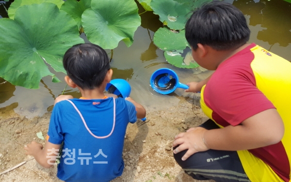 아빠, 엄마와 함께 고사리 같은 손으로 물고기들을 풀어주고, 지난해 서해선 복선전철 공사현장 3공구에서 발견돼 합덕제를 새 터전으로 삼은 금개구리와 수원청개구리가 연잎 사이를 노니는 모습을 보면서 아이들은 자연스럽게 동물 친구들과 교감했다.