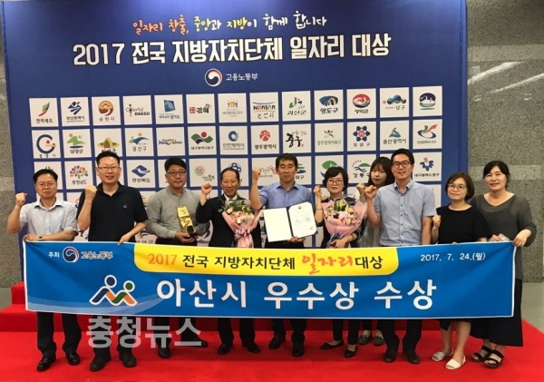 충남 아산시(시장 복기왕)가 고용노동부가 주관한‘지역일자리 목표 공시제’추진실적 평가 결과 우수 자치단체로 선정되어 지난 24일‘2017년 전국 지방자치단체 일자리 대상’시상식에서 기관표창과 함께 9,000만원의 인센티브를 받았다.