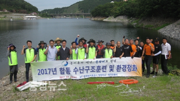 한국농어촌공사 청양지사(지사장 유상선)는 26일 청양군 대치면 광대리 칠갑저수지(수혜면적 682ha, 저수량 4,760천톤) 일원에서 청양소방서와 수난구조훈련 및 환경정화 활동을 실시 하였다.