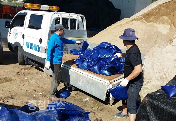 기습폭우에 대비해 모래주머니 3만개를 침수 우려지역에 긴급지원하기로 한 가운데 직원들이 모래주머니 배부를 위해 차량 적재를 하고 있다.