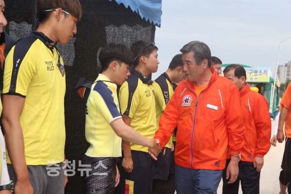 지난 26일 오전 대천해수욕장을 방문해 분수·머드·만남·시민탑 광장에서 스카이바이크와 여름시청, (사)대천관광협회, 특수임무수행자회, 머드축제조직위원회, 여름경찰서, 119해변구조대, 해수욕장지구대, 신흑자율방범대, 물놀이 안전센터, 청소년유해환경감시단, 적심자 인명구조대, 환경미화원, 해병전우회 등을 방문하며 차례대로 격려했다.