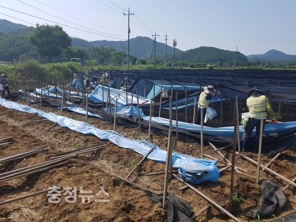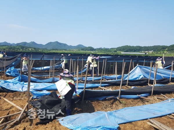 충북 괴산군 제월리의 침수피해가 심한 인삼재배 농가를 찾아, 지주목과 차광막 제거에 힘을 보탰다.