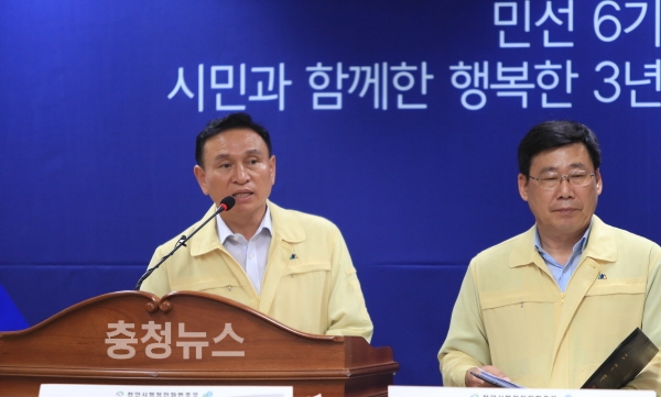 구본영 천안시장은 27일 브리핑을 통해 이번 집중호우로 인명피해는 없으며, 재산피해는 공공시설 5개 분야 163개소 196억원, 사유시설 6개 분야 1,938건 20억원으로 총 216억원이라고 밝혔다.
