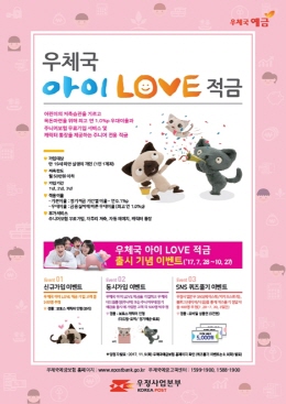 ‘우체국 아이LOVE적금’은 영유아부터 초·중·고등학생 등 만19세 미만의 개인이면 누구나 전국 우체국에서 가입할 수 있고, 저축한도는 월 최대 50만원까지 가능하다.