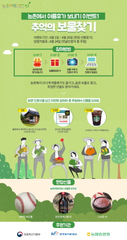 행사기간은 오는 8월 1일부터 20일까지로 전국 농촌체험휴양마을과 팜스테이 마을 40곳에서 실시되며 류현진 싸인볼, 천연 동백기름, 고추장 등 다양한 선물이 마련되어 있다.