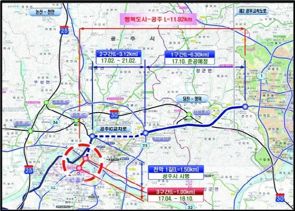 한편, 행복청은 행복도시-공주 연결도로 1구간(행복도시~송선교차로, 6.3km) 및 2구간(송선교차로~공주IC교차로, 3.1km) 공사를 각각 올해 9월 및 2021년 완료를 목표로 추진하고 있다.
