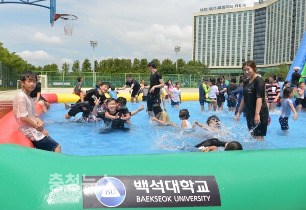 운동장에 설치된 수영장에서 물놀이를 즐기고 있는 참가자들. /사진제공 백석대