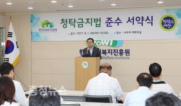 산림청 한국산림복지진흥원(원장 윤영균)은 1일 대전 서구 둔산동 진흥원 대회의실에서 윤영균 원장을 비롯한 전직원이 참석한 가운데 ‘부정청탁 및 금품 등 수수의 금지에 관한 법률 준수 서약식’을 가졌다고 밝혔다.
