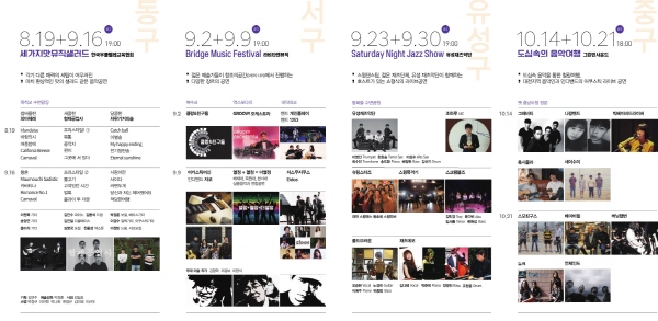 이번 사업은 전통타악그룹 굿의 공연을 시작으로 동구 목척교 수변광장(한국우쿨렐레교육협회), 서구 복수교(라비타앤뮤직), 유성구 동화울 수변공원(유성재즈악단), 중구 옛 충남도청 정문에서 열리는 그린빈 사운드의 공연까지 5개구 원도심 지역에서 지역 청년예술가들이 다채로운 공연을 펼친다.