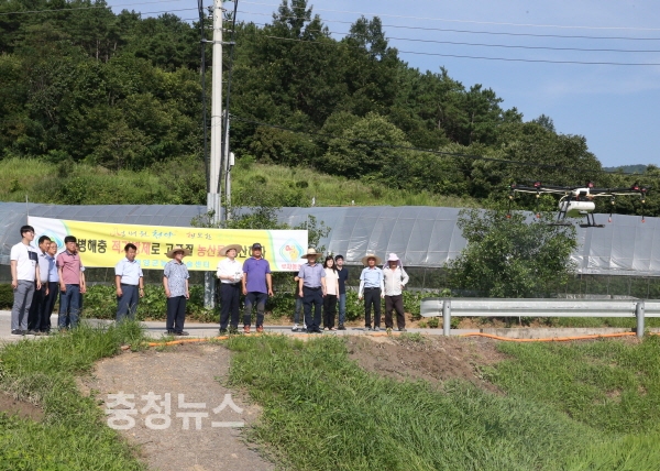 충남 청양군(군수 이석화)은 지난 4일 청양읍 정좌리 논 포장에서 농업인과 관계공무원 등 20여명이 참석한 가운데 벼 병해충 공동방제 드론 연시를 가졌다.