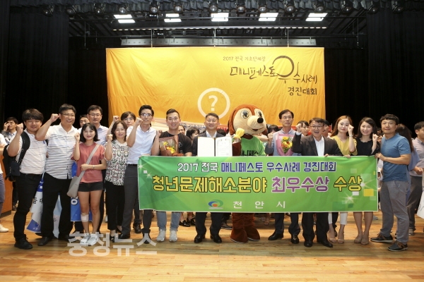 충남 천안시가 한국매니페스토실천본부(사무총장 이광재)가 주최한 2017 전국 기초단체장 매니페스토 우수사례 경진 대회에서 청년문제해소 분야 최우수상을 받았다.