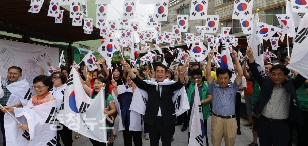 한편 이날 행사장 한쪽에서는 지난 10일부터 주민들이 광복을 경축하고 대한민국을 응원하는 메시지를 태극기 밑그림에 적는 이벤트로 만들어진 ‘마음모아 태극기’가 걸려 있어 또 다른 주목을 받았다.