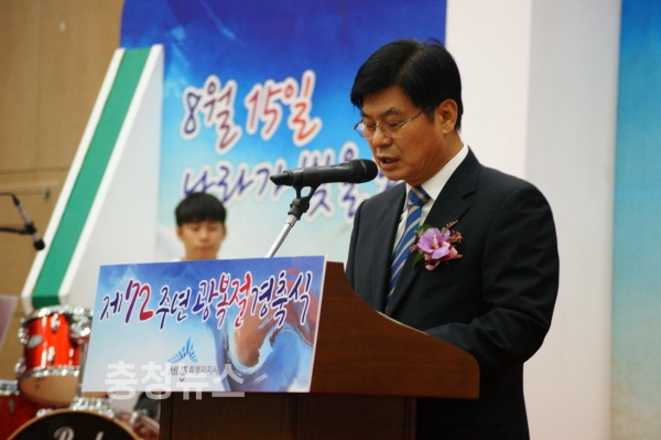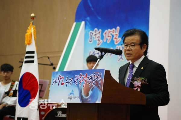 이춘희 세종시장은 15일 경축사를 통해 "외세에 의해 국운이 좌우되었던 의존적 역사를 청산하고 우리의 힘으로 한반도 평화를 정착시켜야 한다"고 밝혔다.